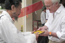 刘栋先生代表天津一行向澳大利亚大使,赠送达扎寺艺僧精制、七世达扎活佛开光加持的彩绘泥擦。