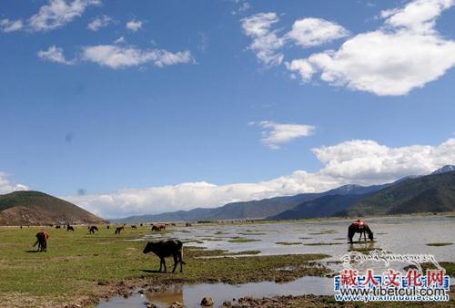 云南香格里拉引水入湿地公园 还纳帕海碧草蓝天
