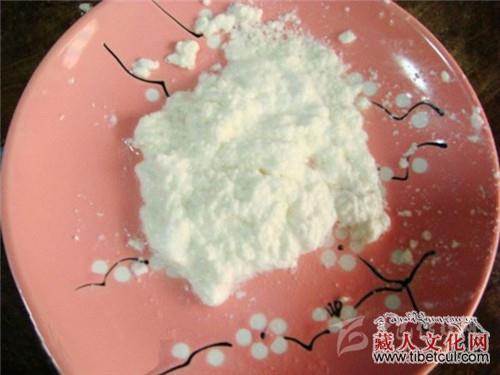 奶渣点心,藏语称“特”。奶渣的做法很简单,通常选用做酥油剩下的奶渣筛出细奶渣,或用小石磨磨成粉,加入白糖拌匀,盛在盆内,浇入融化的酥油,冷却凝固成形后即可取出食用。