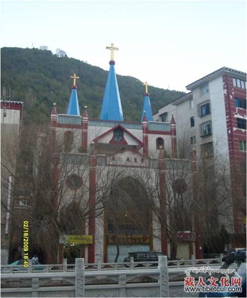 康定天主教堂位于康定城区沿河路,是1997年新建的仿哥特式建筑,是康定地区天主教徒的主要活动场地,有一位康巴藏族的神父。 康定地区天主教起源于1852年,法国巴黎传教士丁盛荣在康定北郊首设教堂传教,原属西藏教区。1939年从西藏教区划出,单设康定教区,辖区之广居全国八大教区之首。图7