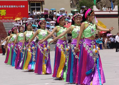 仪式多在寺庙或寺庙附近的坝子上举行,由女孩的舅舅或德高望重的老人主持,程序烦琐,气氛热烈。亲友会向她祝福,赠礼物,她则回报以哈达和酒,也要不断地跳锅庄。先是逐个跳,后和亲友、朋友一起跳,直到日落西山。