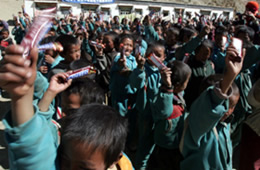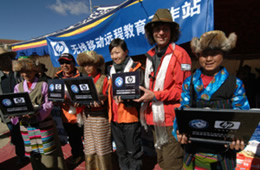 定日中学的孩子们和志愿者一起展示受赠电脑 随行记者拍摄志愿者捡垃圾的镜头